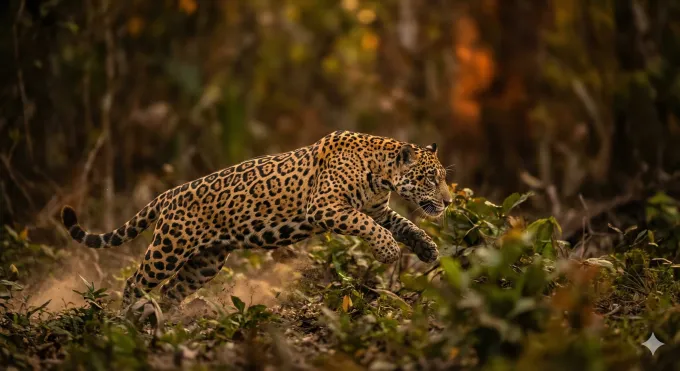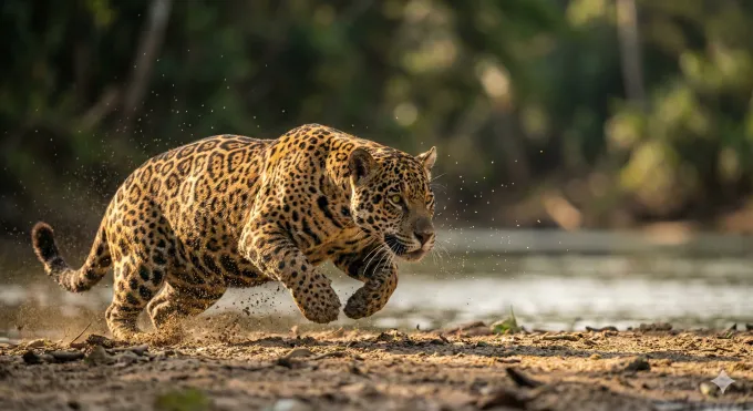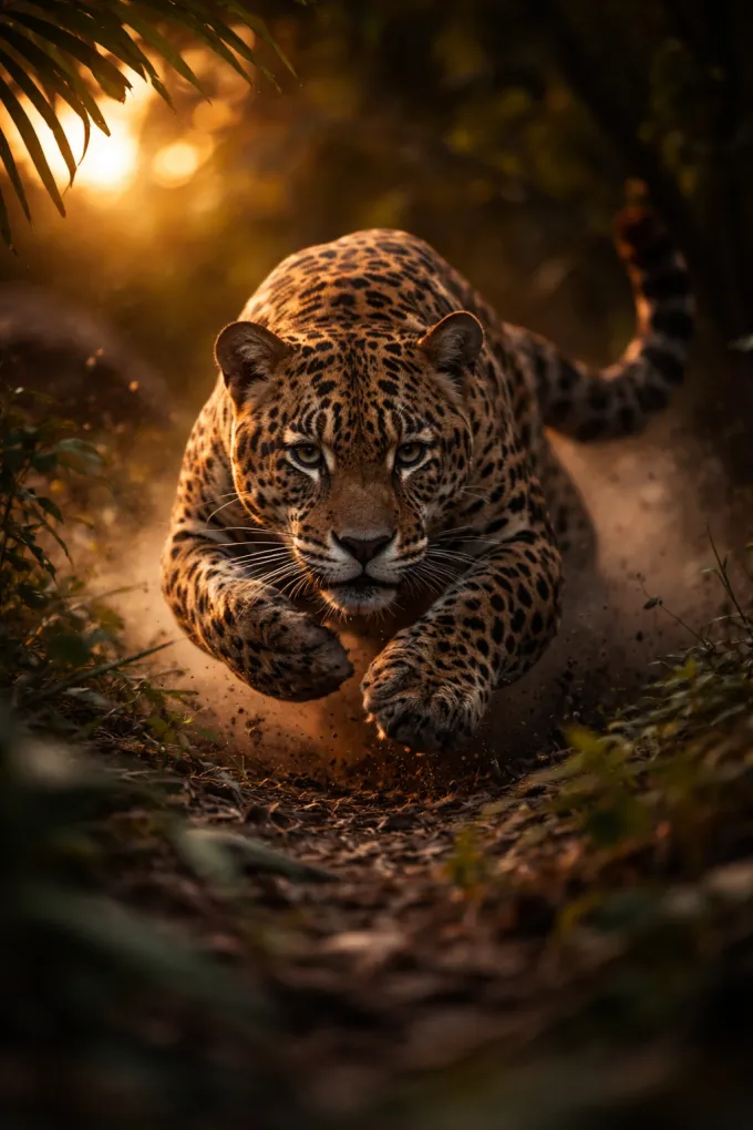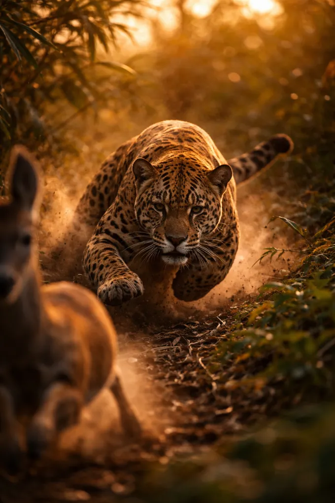 The jaguar is captured mid-hunt, fully focused on its prey, body low, muscles tense, powerful forward motion, dust and debris naturally displaced by its movement.