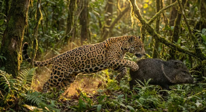 The jaguar must not look at the camera, eyes locked on the prey, authentic predatory behavior.