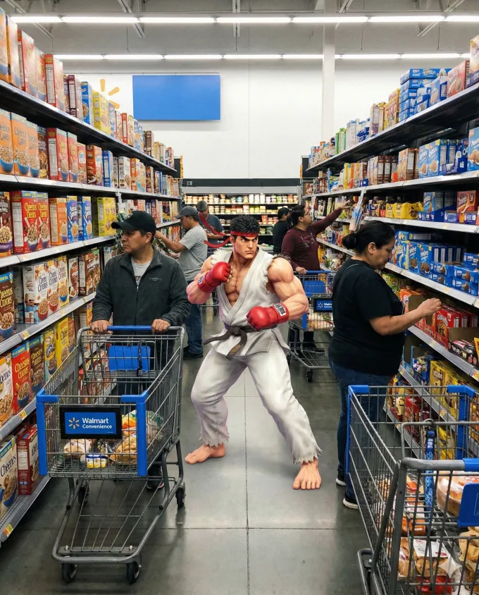 Ryu begins the scene by performing a backflip. Landing on his feet, he adopts a firm stance and begins unleashing rapid, powerful blows toward the cereal boxes on the left side of the aisle. The movements are exaggerated and stylized, true to the classic animations of the Street Fighter video game.As Ryu attacks the products, the people around him react with surprise: they turn their heads to look at him and begin to hurriedly leave the aisle, pushing their carts away from the scene.